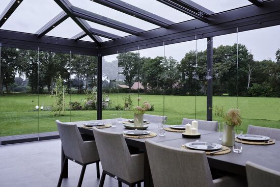 Die B-800 ist unsere neuste Errungenschaft. Licht und Helligkeit stehen im Zentrum. Auch bei Regen ist es sehr gemütlich unter diesem Glasdach. Das Dach wird nach Mass produziert. Überzeugen Sie sich selbst, wir haben das Dach in einer von unseren Ausstellungen.