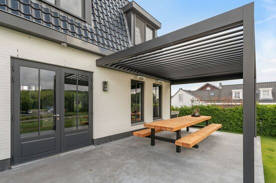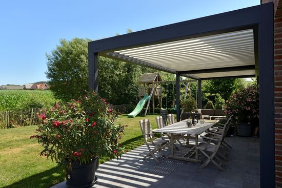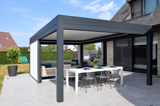 Die B-720 ist eine Kombination aus einem festen Dach aus Glas und einem Dach mit kippbaren Lamellen. Sie ist vielseitig einsetzbar, entweder als ein trockener Bereich für Ihre Möbel oder eine Aussenküche, als Überdachung für eine stilvolle Bar oder als Gartenaufbewahrung in Kombination mit einer gemütlichen Terrasse.