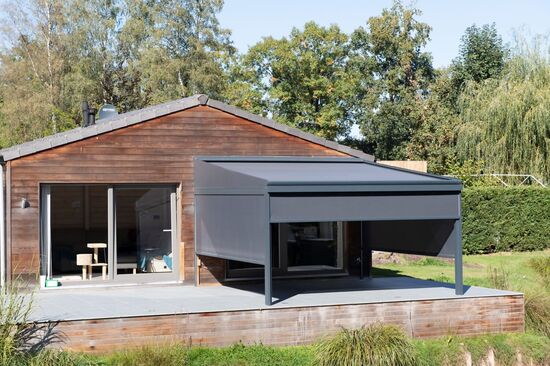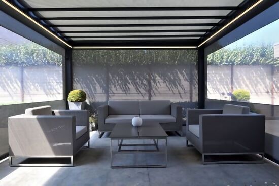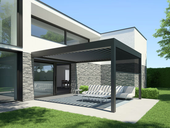 Die B-128 XL Pergola ist eine schlichte Terrassenüberdachung. Das Dach ist mit der ZIP-Screentech-nologie ausgestattet. Durch die optimale Tuchspannung ist das Tuch stets eine glatte windbeständige Oberfläche und Regentropfen verschwinden schnell in der unsichtbaren Regenrinne.