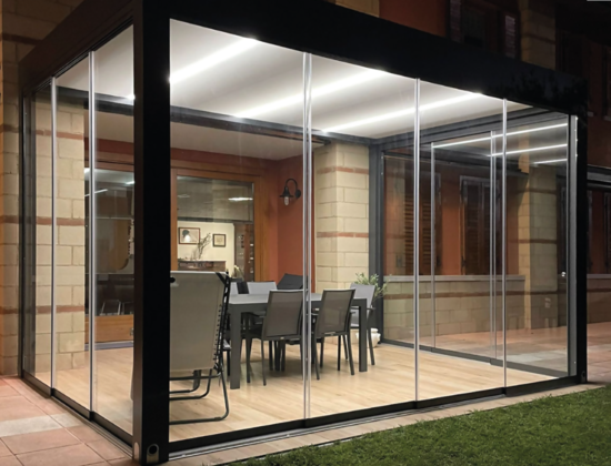 Die Eclettica-Pergola von Giulio Barbieri ist eine wartungsarme, wasserdichte Überdachung mit Dämmung, schneefestem Dach, integrierter Photovoltaik, Entwässerung, LED-Beleuchtung und Schiebeverglasung.